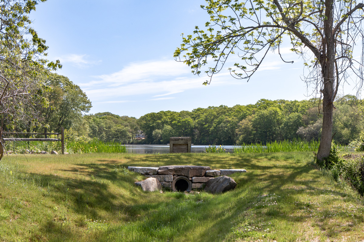 After a generous donor stepped up to underwrite material costs in 2020, Landscape Creations volunteered labor to help SKLT with the much-needed property restoration. Working within RI DEM guidelines, Landscape Creations began repairs by clearing brush and shaping the sluiceway in areas where brush had been cleared. Next, we built a new stone headwall in the sluiceway, extended the pipe connecting the pond and sluiceway, and installed French drains to prevent water from pooling when the sluice is not in use. To finish, crews added fill and gravel material at the sluice and pond weir, spread topsoil in newly disturbed areas, and applied a specialty hydroseed that grows well on hill areas, perfect for the steep banks of the sluice. Upon completion, the Land Trust can once again funnel water with ample pressure to turn the grinding stone at the mill.